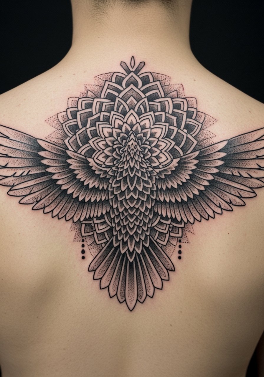 Combining mandala geometry with an eagle creates a guardian, balanced piece. Upper back symmetry allows the mandala to sit perfectly across the spine. Dotwork ages well when applied densely. I always tell people to preview placement mockups—mandalas need perfect alignment to read as intended.