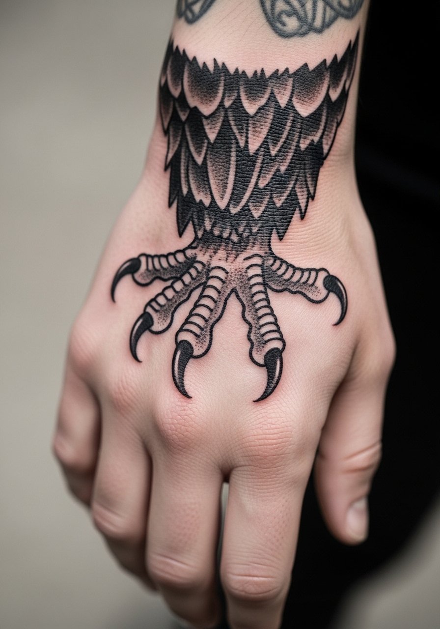 Hands are unforgiving for tattoos, but talon motifs look aggressive and bold. Expect faster fading and touch-ups because of friction. From what I've gathered in tattoo groups, strong black fills and simpler shapes help hands age better. Avoid fine feather detail here; solid shapes maintain the message.