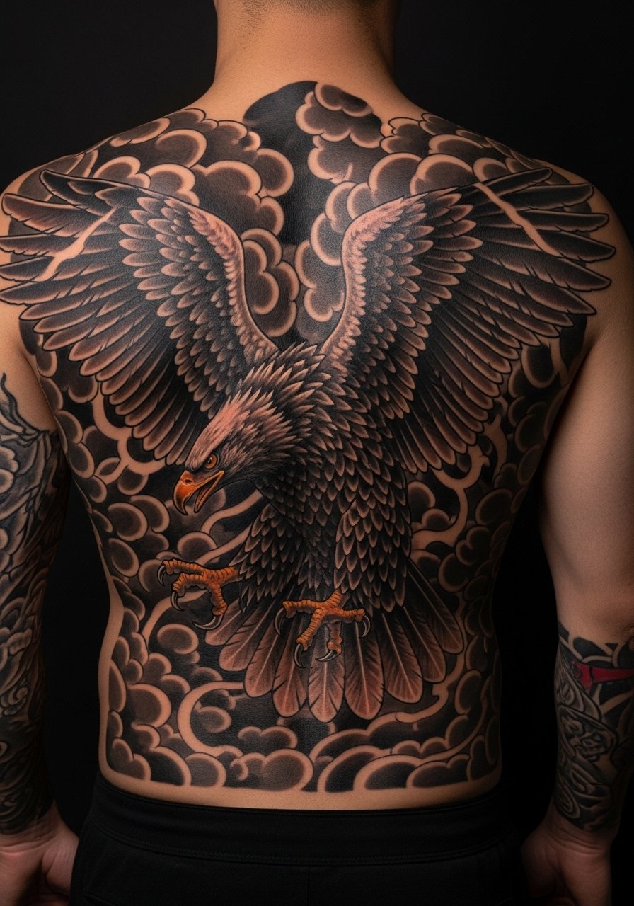 A full-back guardian eagle is perfect for cover-ups—its wings can hide old shapes. Expect long sessions and layered shading. From what I've seen, cover-ups need dense darks and strategic highlights to avoid remnants showing through. Work with an artist experienced in cover-up planning and ask for mockups.
