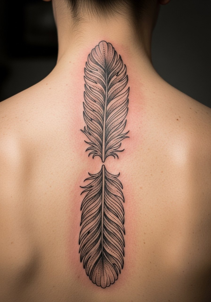 A spine line of feathers reads elegant and strong. It moves with posture and can be shown or hidden easily. Spine work stings more, and healing needs cautious sleeping positions. From my experience, keeping feather stems slightly thicker prevents early blurring.