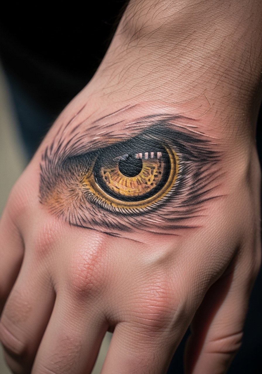 An eye on the hand is confrontational and symbolic of vigilance. As with other hand tattoos, friction accelerates fading. I recommend bold contrast and acceptance of likely touch-ups. Artists who do micro-realism on hands are rare—review healed portfolios closely.