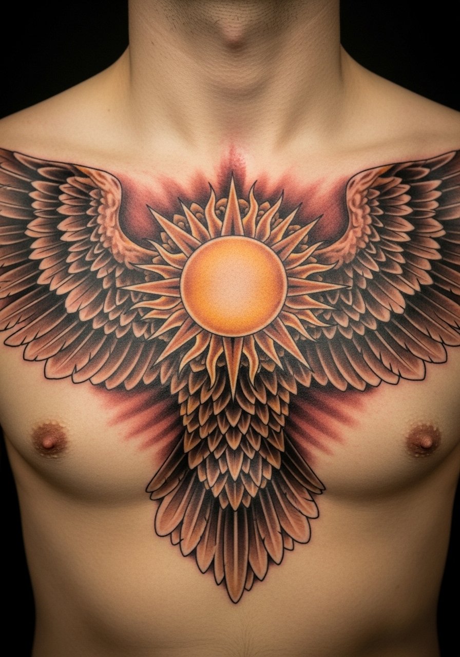 Merging a mandala sun with an eagle blends masculine power and spiritual balance. Center-chest placements benefit from symmetry checks and multiple sittings. I've seen these look cohesive when artists use clear contrast between ornamental lines and the eagle's silhouette. Avoid tiny mandala filigree near high-movement zones.