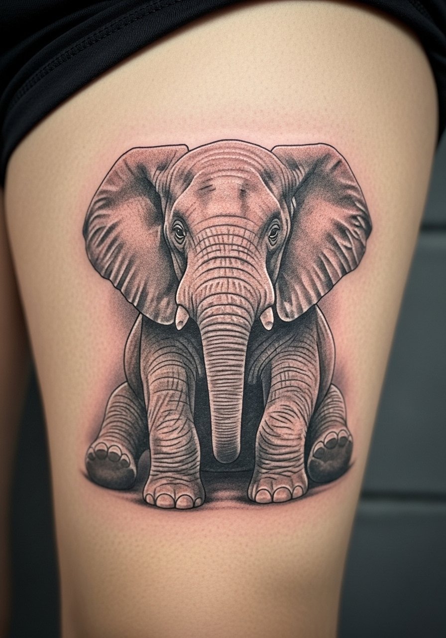 I love realism for the emotional weight it carries—a sitting elephant looks contemplative and familial. The thigh is forgiving for large, detailed work and is easy to hide. Pain is manageable; longevity of shading depends on saturation and aftercare. Realism needs an artist experienced in fine shading; otherwise the texture reads muddy once healed. One mistake I've seen is choosing too-small dimensions for realism—tiny photorealism rarely reads well after healing. Ask to see healed realism samples on similar skin tones to set expectations.