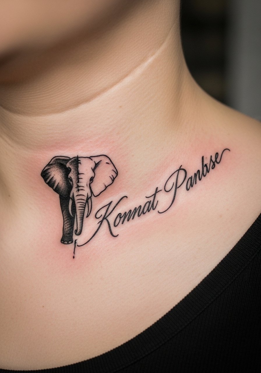Pairing a half-elephant silhouette with a short script makes the piece personal without becoming a portrait. Collarbone placement reads intimate and looks great with jewelry. Expect medium pain near the bone and some tenderness after. Script needs an artist who writes well in tattoo form—sloppy lettering is the most common regret. From my experience, keep phrases short and choose a lettering style that matches the elephant’s mood (delicate script for subtlety, block lettering for boldness). Protect this area from sun to preserve ink edges.