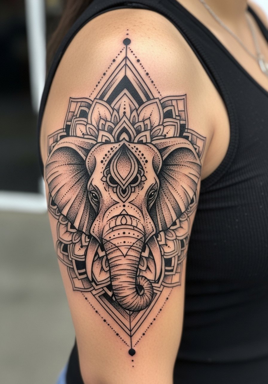 Mandala elephants blend spiritual geometry with the animal’s wisdom symbolism—great for people who want meditation or harmony vibes. Upper arm placement is forgiving and sits well with clothing. Mandala detail ages well if the artist spaces lines correctly; too-fine dots and lines can blur. A common error is packing too much tiny detail into a small area—ask your artist to scale the mandala so patterns read clearly healed. Dotwork and black geometric fills tend to hold up longer than tiny colored accents.