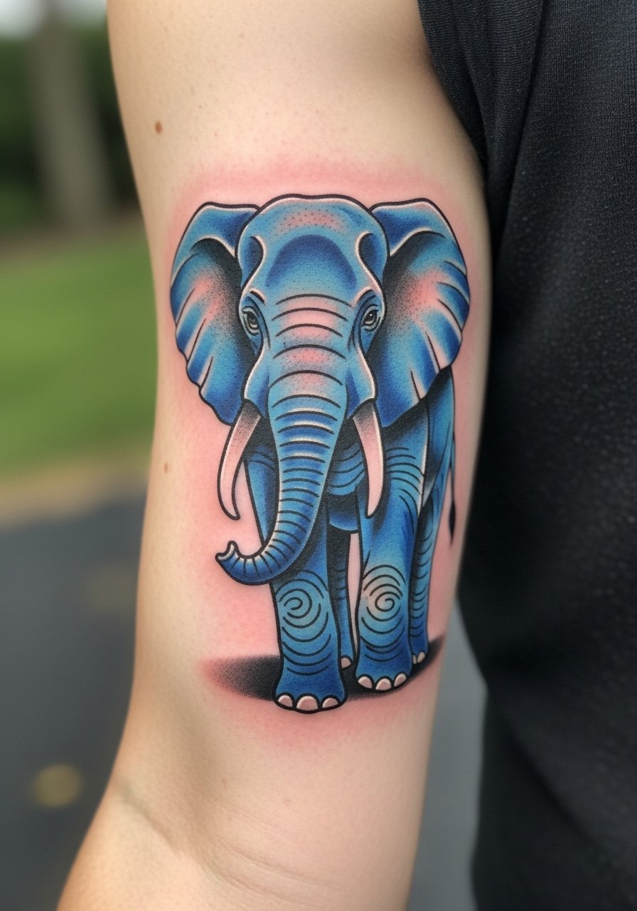 A vintage blue elephant leans into fantasy and uniqueness—blue tones make the design feel nostalgic and distinctive. The bicep is a great canvas for color saturation and muscle flow. From what I’ve noticed, color ages differently across skin tones; blue can hold beautifully but needs proper saturation and long-term sun protection. Avoid pastel washes that flatten—ask for richer pigments and layered packing. If you want color to last, plan on follow-up sessions to refresh saturation as the piece ages.