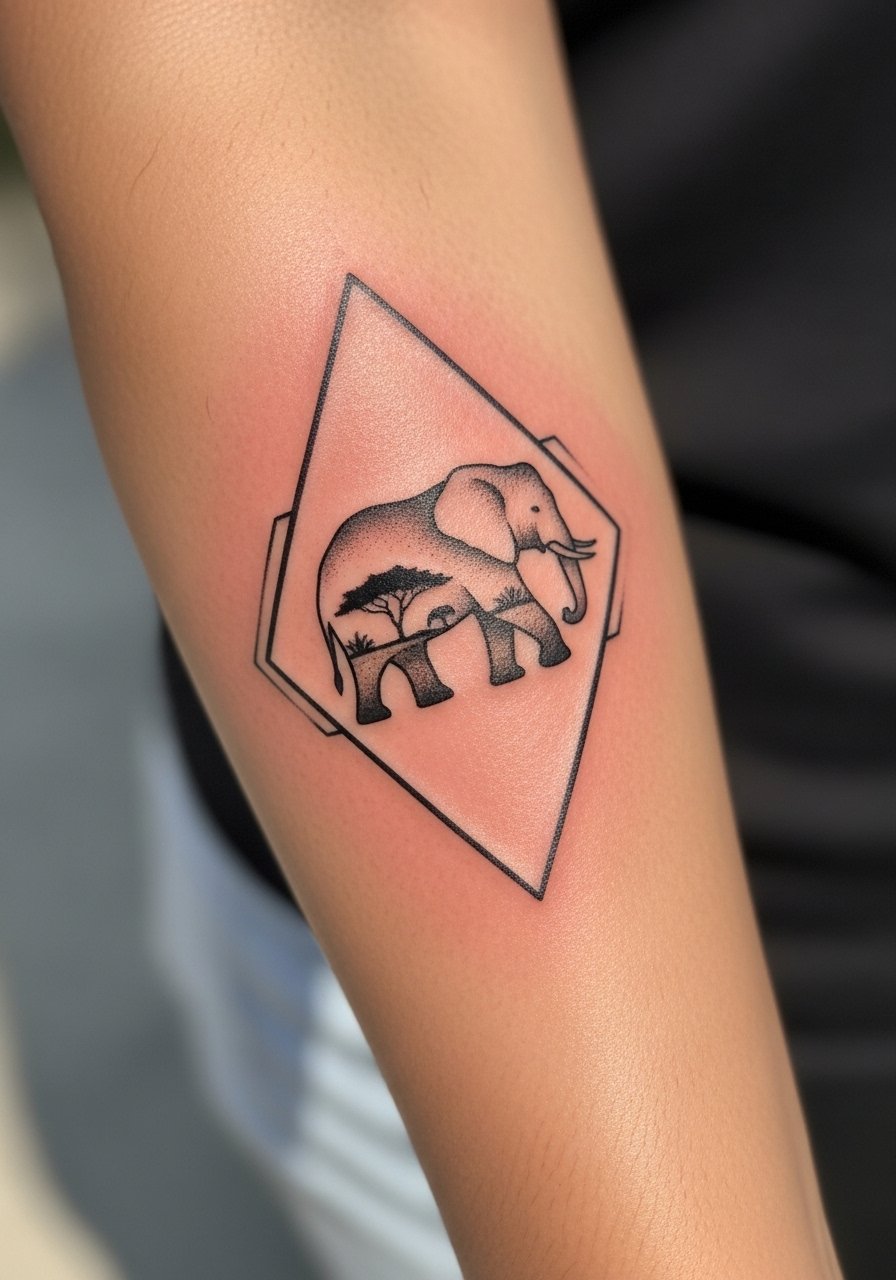 I like the circles-and-arrow layout because it lets you nest a tiny scene inside an abstract frame—an elephant silhouette with distant trees feels poetic. Forearm placement is visible but easy to cover. Pain is low; aging is typically fine for bold lines but the tiny internal scenery needs careful scaling. A frequent mistake is squeezing too much landscape detail into the diamond—ask the artist to simplify or focus on silhouette contrasts so it stays legible healed. This style benefits from a mix of geometric precision and gentle shading.