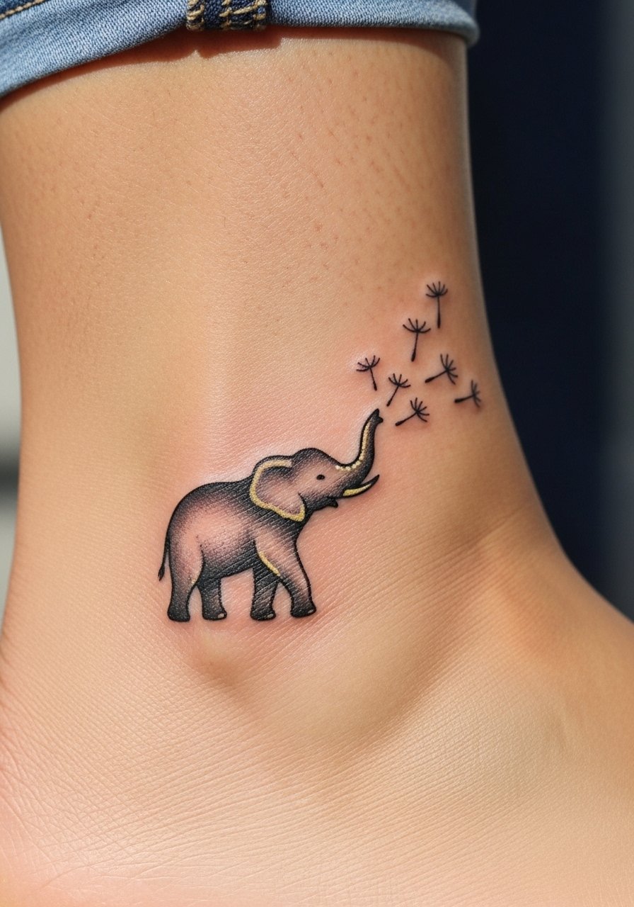 Combining a dandelion with an elephant creates a soft narrative about healing, release, and memory. The ankle gives a low-profile placement but remember the bone makes it one of the more painful spots. Fine details and tiny seeds can blur if too small—I've seen seed dots disappear into skin texture. For longevity, ask your artist to slightly enlarge focal elements and consider black-and-gray for the smallest details. Keep this area moisturized and avoid tight footwear while healing.