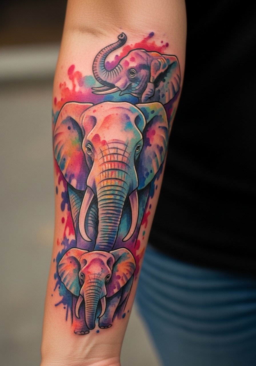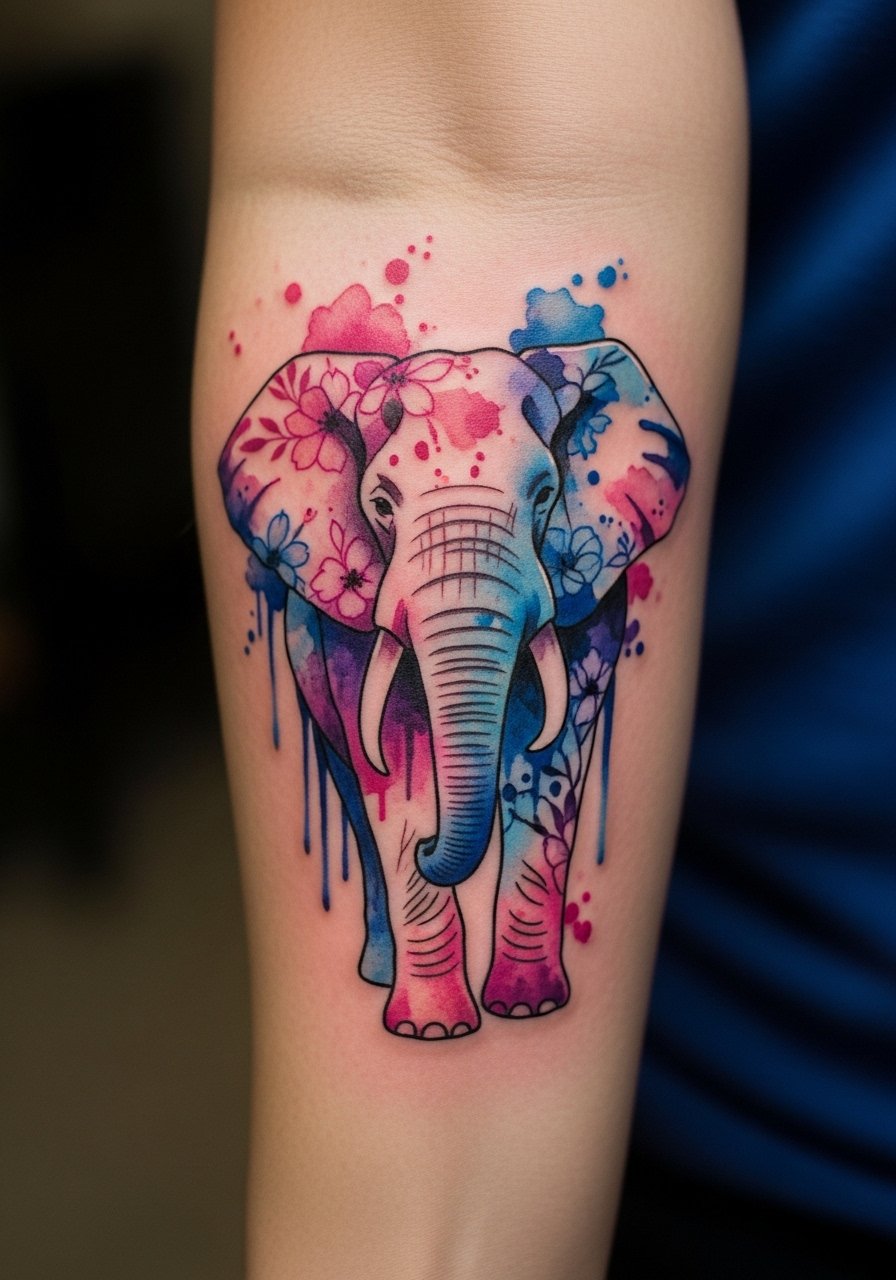 A watercolor sleeve lets you tell a story—multiple elephants, color splashes, and floral elements create motion. Forearm-sleeve work requires color layering; expect several sessions. From what I've seen, watercolor needs anchor lines or neo-traditional elements to prevent colors from becoming a blur after healing. Ask your artist how they plan to retain contrast over time. Long-term care with SPF and occasional touch-ups will keep colors from going flat.