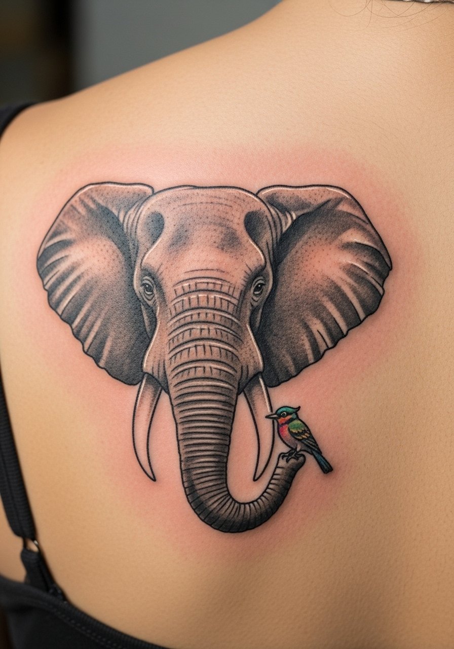 Pairing a bird with an elephant symbolizes the balance between loyalty and freedom. Shoulder blade placement sits nicely under clothing and moves naturally with the scapula. Pain is usually low. Small birds with delicate color highlights can remain crisp if the ink is well-saturated. A common oversight is making the bird too tiny—scale the bird to complement the elephant so both elements age gracefully. Request healed photos from your artist of similar compositions.