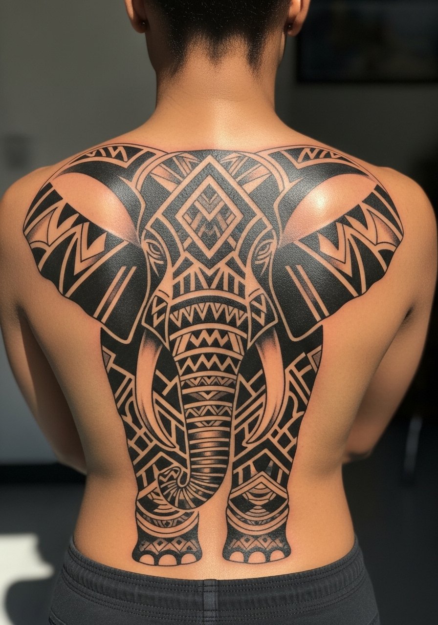 A tribal African elephant uses bold shapes to convey ancestral wisdom and resilience—it's a powerful visual when done respectfully. The back offers a grand canvas but requires stamina for long sessions. Tribal blackwork tends to age well because of heavy pigment, yet small negative-space details can soften. A big mistake is asking for culturally-specific motifs without discussing meaning—I've learned it's important to be mindful of symbolism and collaborate with your artist on respectful design. Ask for portfolio examples of large blackwork on similar skin tones.