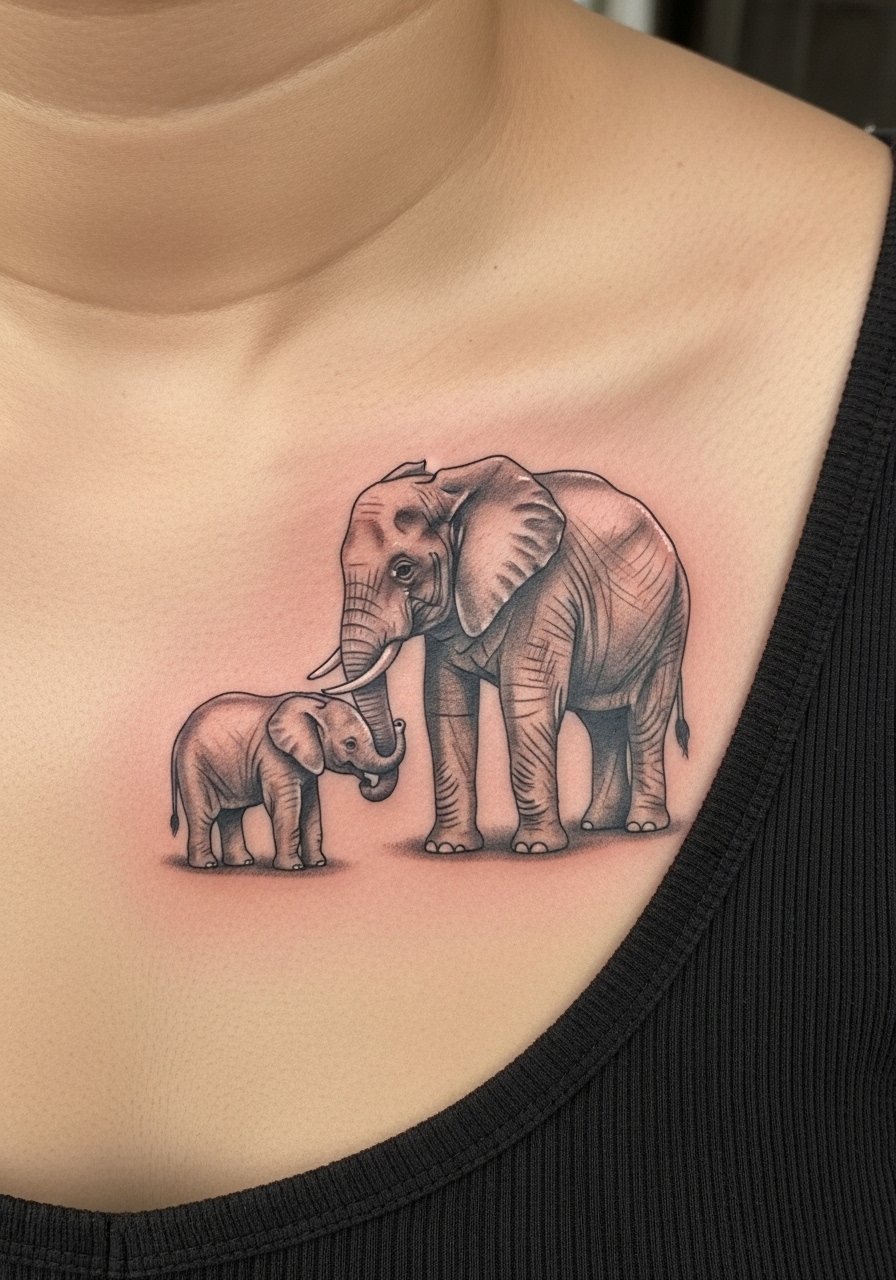 A mother-and-baby elephant across the chest is a classic symbol of family and protection. Center-chest placement reads intimate and meaningful. Pain varies—near bone is sharper. Shading depth matters for emotional resonance; too-flat shading reads lifeless once healed. I've seen people regret tiny separation between figures—ensure enough spacing so both silhouettes age clearly. This composition benefits from an artist skilled in portrait spacing and soft gradients.