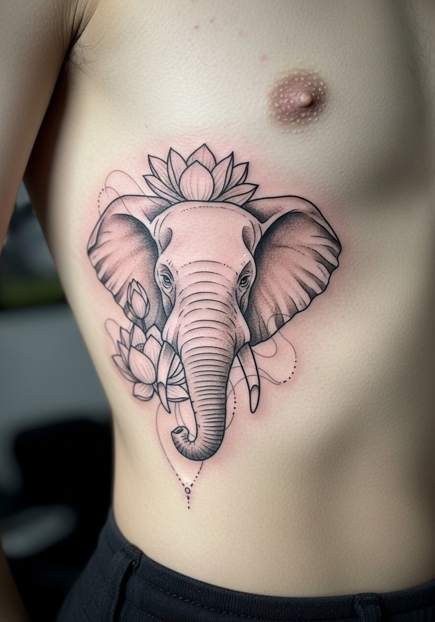 Pairing an elephant with a lotus on the ribcage gives the tattoo a spiritual rebirth connotation. Rib work hurts more, so be prepared—I've talked to people who paced their sessions for comfort. Tiny petals and fine shading risk losing clarity if packed too tight; scale the lotus to balance with the elephant. This placement is intimate and looks great under clothing; discuss how the design curves with your body so it reads healed and natural.