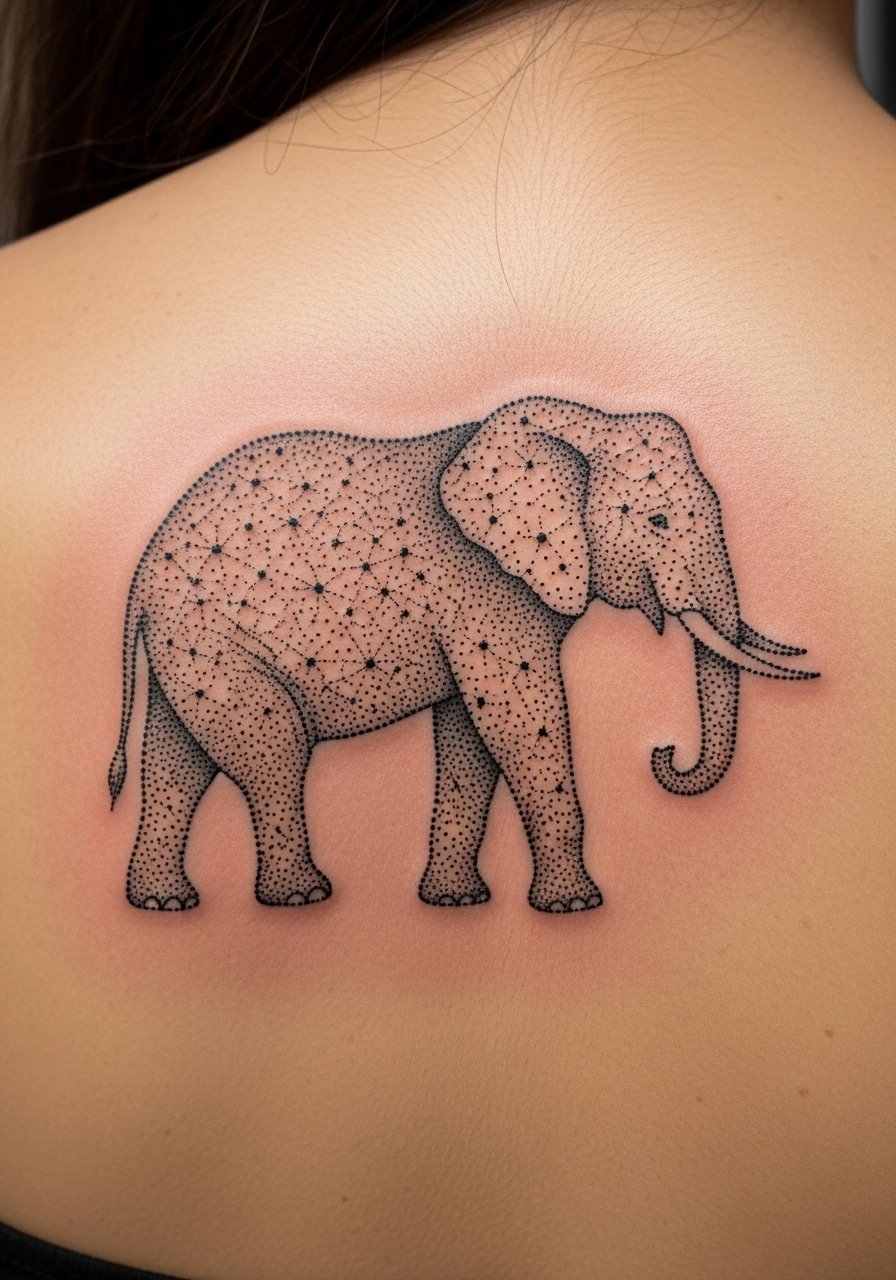 A constellation elephant maps personal meaning to the stars—great for people who like understated metaphor. Upper back placement sits nicely with clothing and has low pain. Dotwork needs careful spacing; overly dense dots can merge during healing. I've noticed artists who do precise single-needle dotwork achieve longer-lasting clarity—ask for healed dotwork examples. Keep this area covered from strong sun early on to protect the small details.