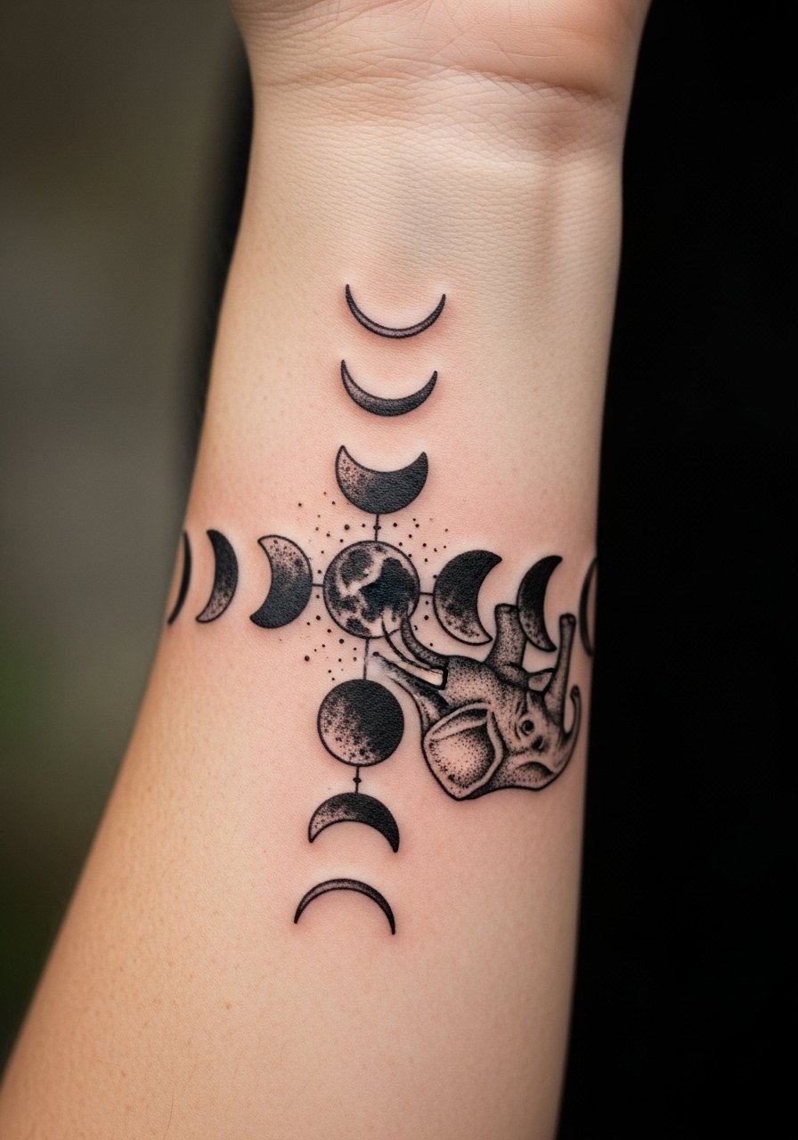 Combining moon phases with an elephant tells a clear story about cycles and inner wisdom. Forearm placement lets you watch those phases daily. The design benefits from solid primary lines and cautious small details. A common mistake is crowding the moons too close—give each phase breathing room so healed contrast remains. From my experience, pairing bold elephant outlines with simplified moons keeps the piece readable long-term.