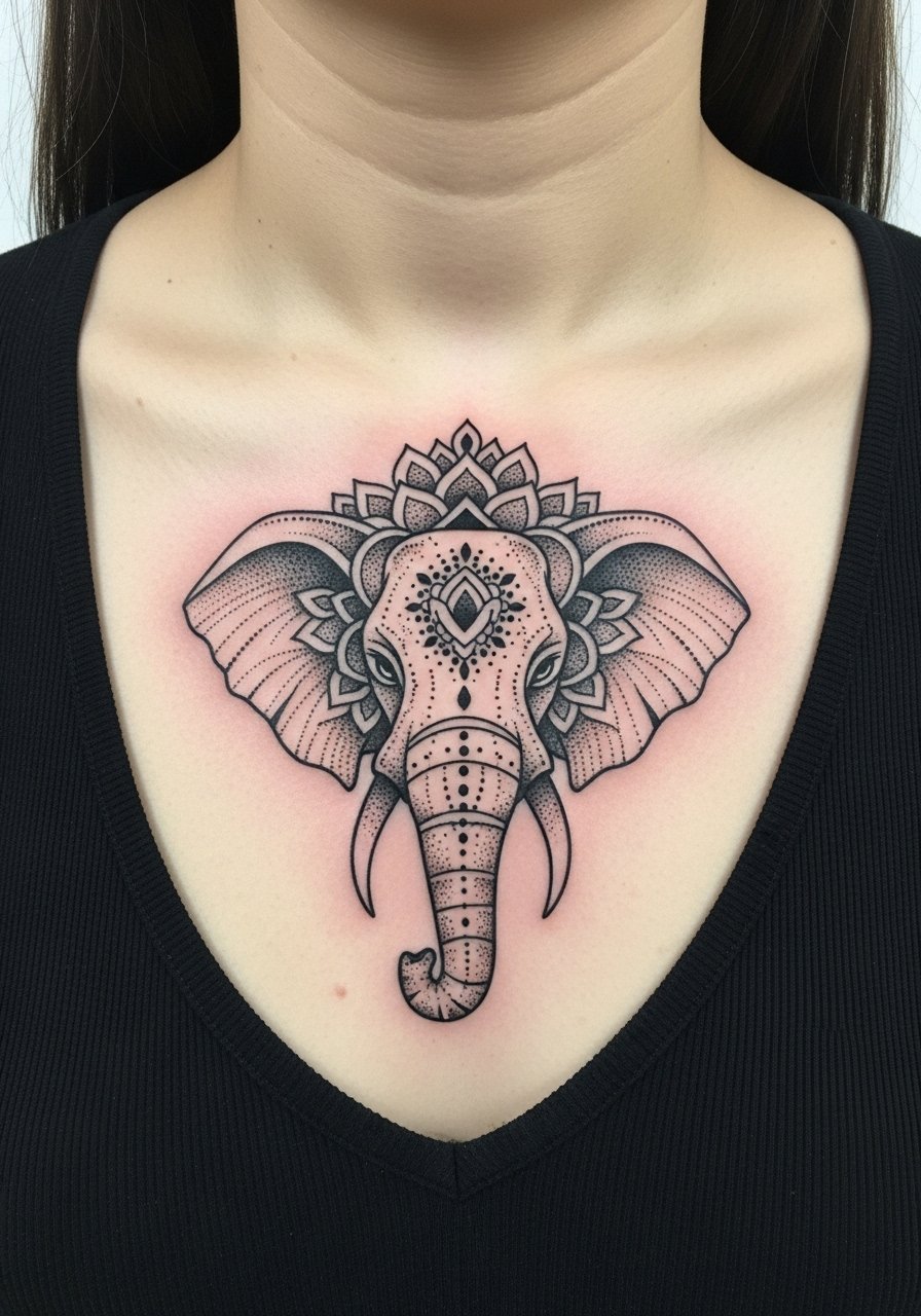 A sternum mandala elephant is intimate and meditative—perfect if you want a central, symbolic anchor. Sternum work can be painful, so many people break it into sessions. Dotwork mandalas age well when the dots have space; overly tight stippling will soften into gray blocks. I always recommend seeing healed mandala photos from your artist to check dot spacing and contrast on similar skin tones.