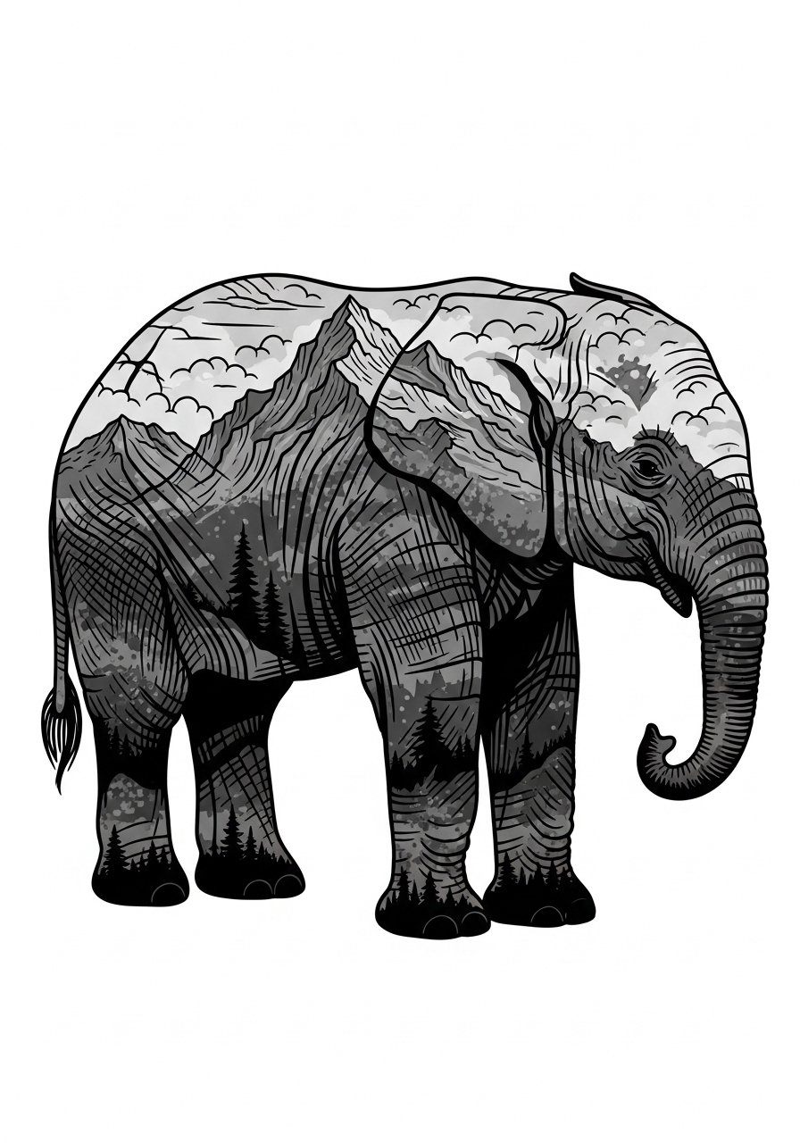 A silhouette that contains a landscape gives an elephant tattoo a narrative quality—place a scene inside to capture a memory or place. The calf offers a good vertical canvas and low pain. Silhouette pieces hold up well because outlines anchor the interior detail. Be careful not to cram too much scenic detail inside the silhouette; simpler landscapes read better healed. I suggest showing the artist your favorite landscape photo to guide composition and contrast choices.