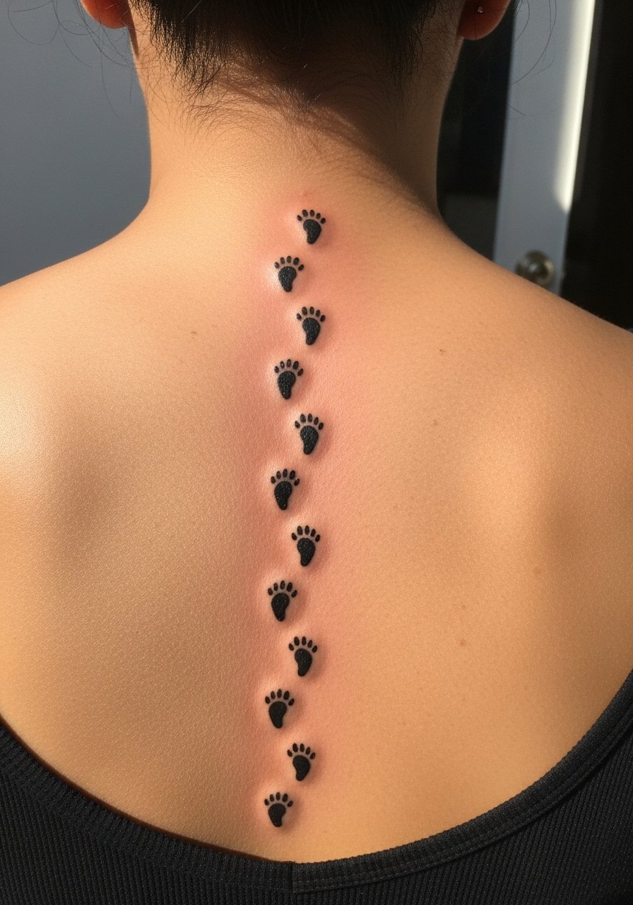 A trail of elephant footprints down the spine evokes journey and persistence. Spine areas can be tender; expect more sensation than on fleshy areas. Tiny footprint tattoos need consistent spacing—if too small, they may blur; ask for a slightly bigger print so the shapes remain obvious healed. This is a design I often recommend people preview with temporary decals to ensure alignment feels right along their spine curvature.