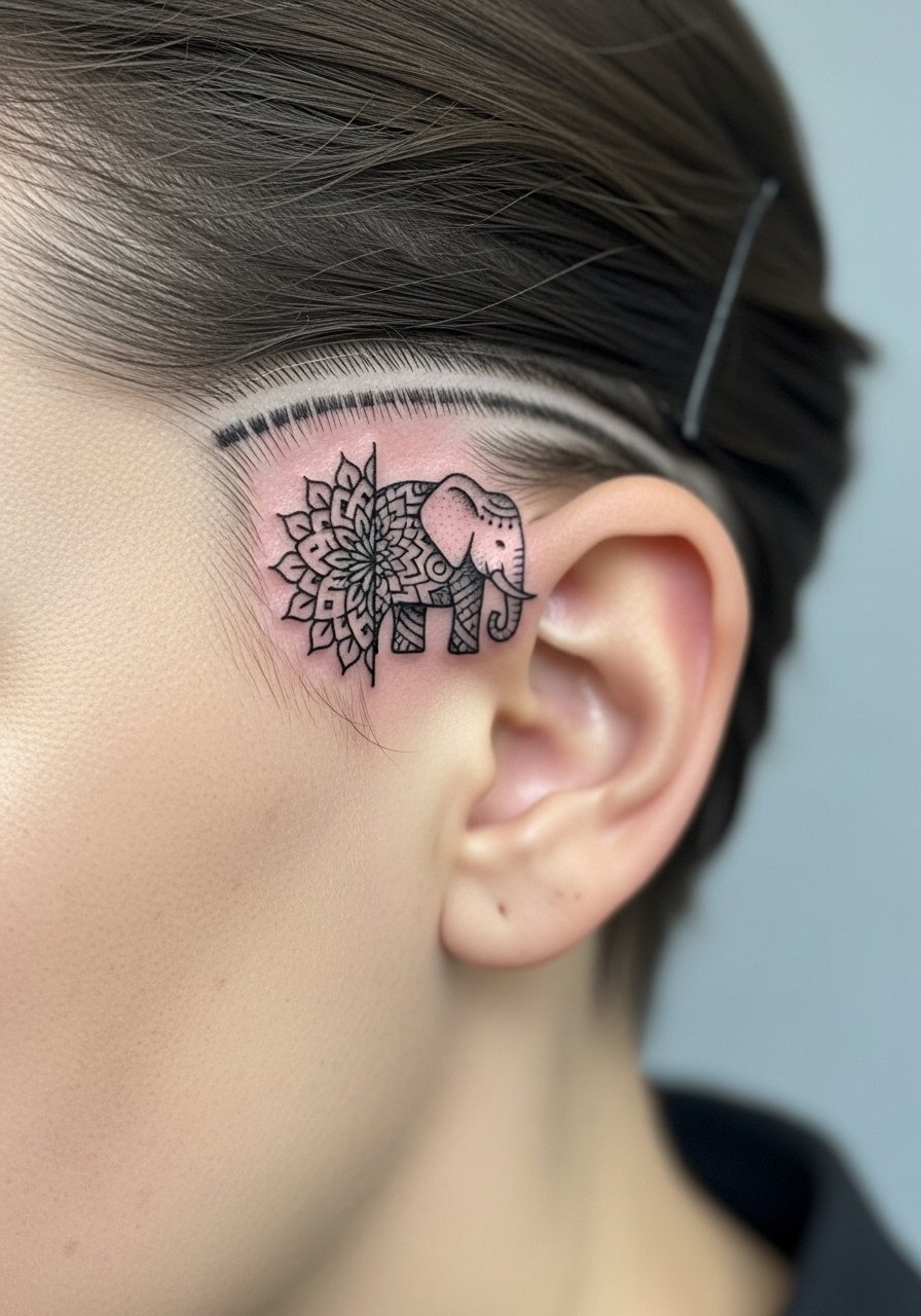 A mini mandala elephant tucked behind the ear is a discreet spiritual accent. That spot is surprisingly sensitive and needs careful aftercare because of hair and sweat. Micro-mandala detail must be simplified—I've seen overly intricate behind-ear designs blur quickly. Ask for a slightly bolder, simplified motif and discuss hairline interference before booking. This placement is perfect if you want private meaning with occasional reveal.