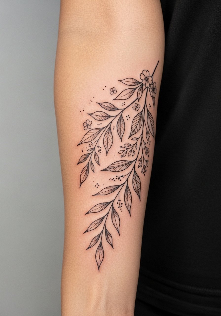 I first saw this on a friend's forearm and couldn't stop staring at the linework. The style uses fine line stems with slightly thicker main branches so the design stays crisp after one year. Expect a 3 to 5 hour session if you want a half sleeve look. Pain is moderate for the inner forearm. Tell your artist you want variable line weight, not uniform hairlines. A common mistake is asking for hair-thin leaves everywhere. That looks fragile healed. At six months the tiny details soften. At two years the thicker anchor lines keep leaves readable. Ask for a small test motif at the start of the session to check settling.