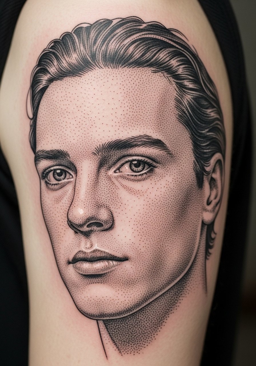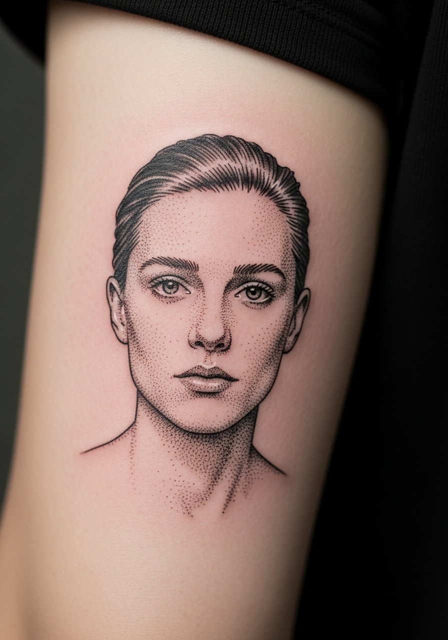 Most single-needle portraits look best when intentionally larger than people assume. I often tell friends to add 20 to 30 percent size. Inner bicep is forgiving for stretch. Pain is medium. Sessions can be long if tonal realism is needed. During consultation ask about stipple shading and if the artist tests needle density. A poor choice is insisting on hairline outlines for faces. Those outlines dissolve. At one year the portrait softens into a realistic wash if sizing and shading are balanced.