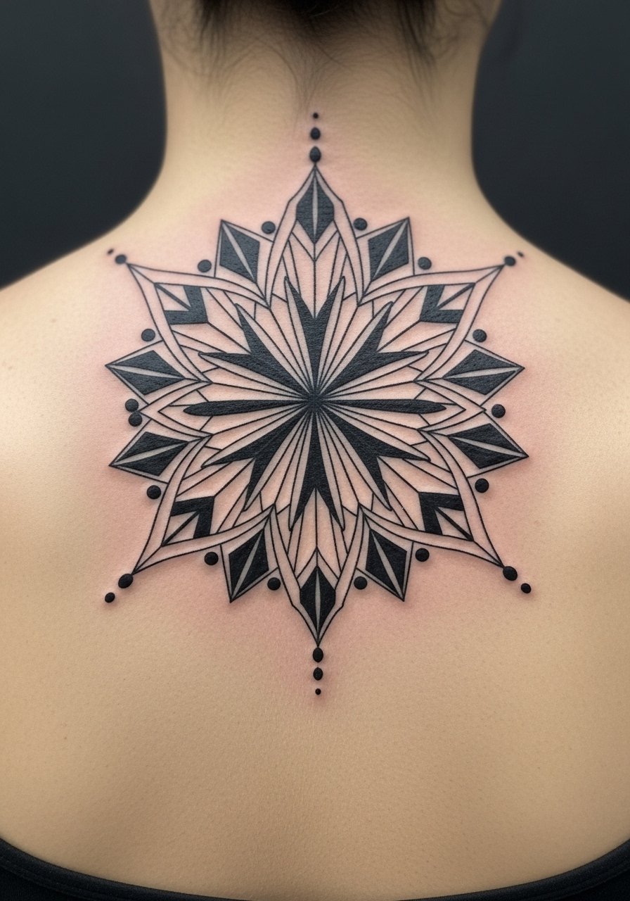 When I first saw this, it read like jewelry on the back. Spine pieces are higher on the pain scale. Sessions may be split. The contrast of solid black anchors and finer radial lines helps the design age well. During consultation ask for stronger central anchors and thinner outer lines. A frequent mistake is making every segment the same tiny width. Small uniform lines blur into a blob. At six months the outer lines soften. At three years the central blacks still read if the artist packed ink well.