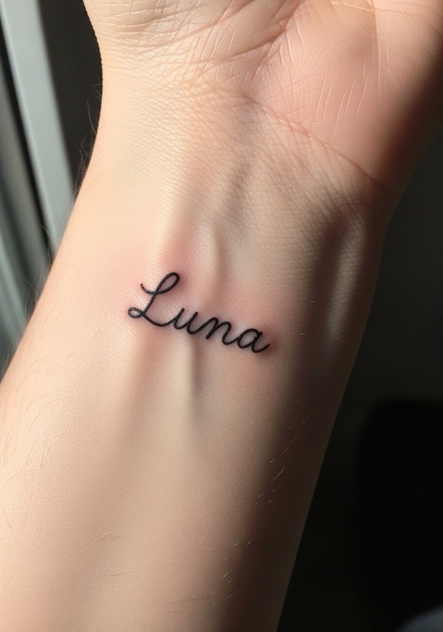 If you want a name, I learned to choose medium-sized script over delicate micro script. The wrist moves a lot so lines can blur. Pain is low to moderate. Sessions are quick. Tell your artist the exact font and ask them to stencil it on while you move your wrist. Avoid asking for ultra-thin strokes. Healed, hairline scripts can break up. At six months letters may thicken visually. Ask for slightly stronger downstrokes for longevity.