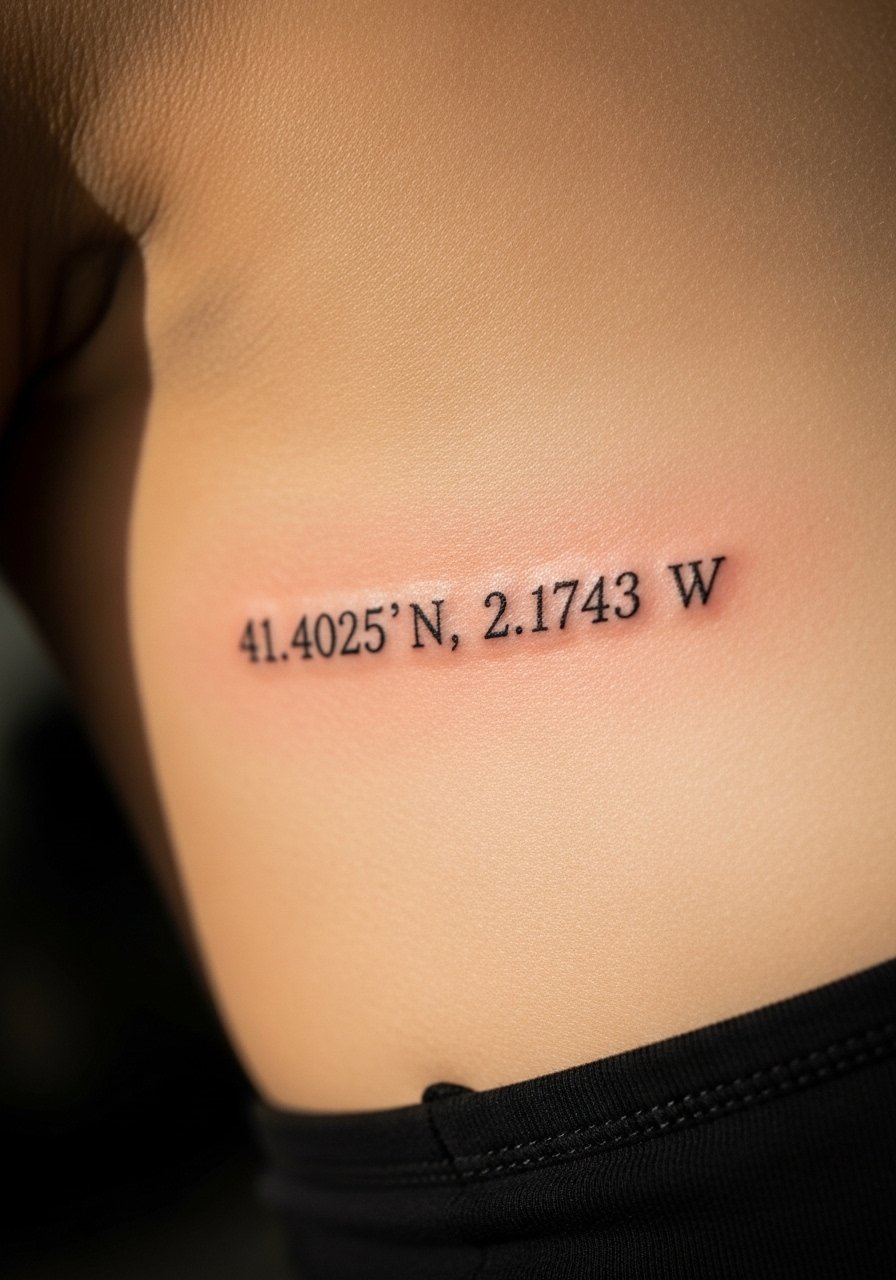 I chose coordinates for a travel memory. Script can smear, so use monospace numerals and slightly bolder dots. Ribcage pain is high. Sessions are quick for text. Tell the artist you want exact spacing and ask for proof of stencil placement while you move. A common mistake is tiny numerals. After a year, very small numbers can lose legibility. Increase size modestly to avoid that.