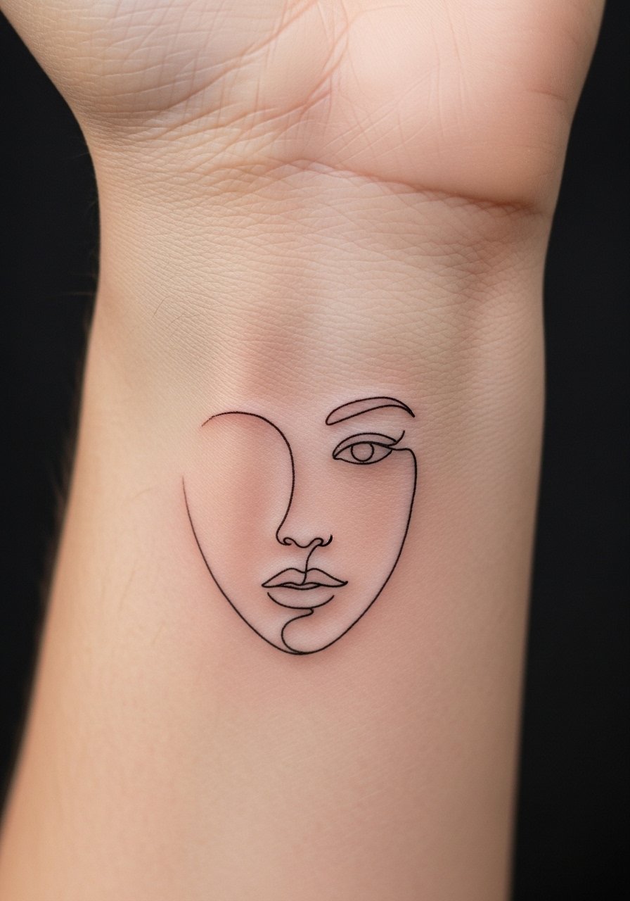 Artists I follow are doing abstract faces with controlled breaks in the line. The wrist moves a lot, so ask for planned interruptions to keep the face readable as the lines settle. Pain is low to moderate. Sessions are short. A typical mistake is demanding an unbroken continuous line at hairline thickness. Healed, it can blur and lose the face. At one year the breaks help the shape read consistently.