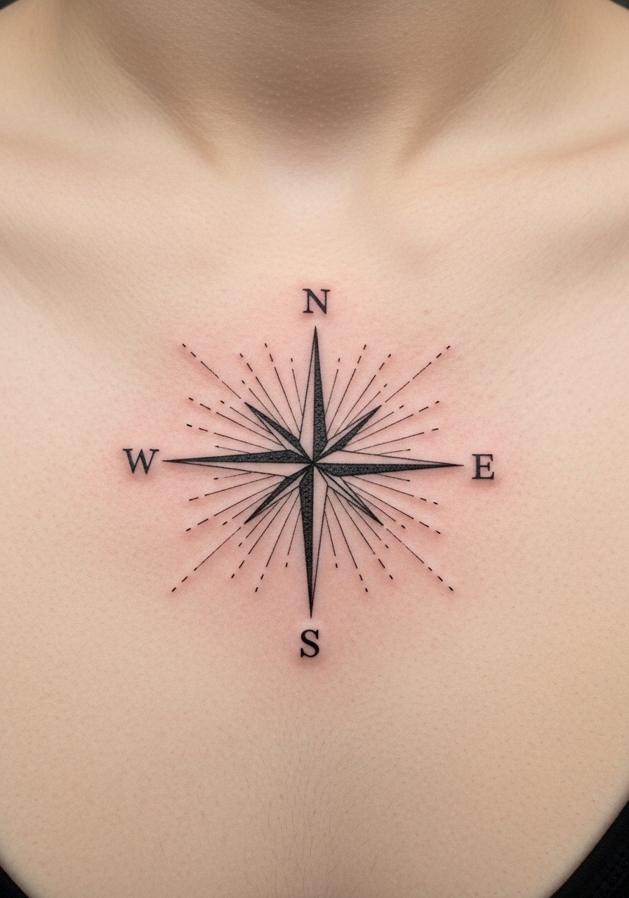 Most artists I know add bolder cardinal points so compasses keep direction visually after healing. Sternum tattoos are painful and often done in short bursts. Expect a higher pain level and a 1 to 2 hour session for a small compass. Tell your artist to strengthen every fourth radial line. A mistake is equalized hairline rays. At six months hairline rays can fade into a gray wash. Stronger anchors maintain the compass identity.