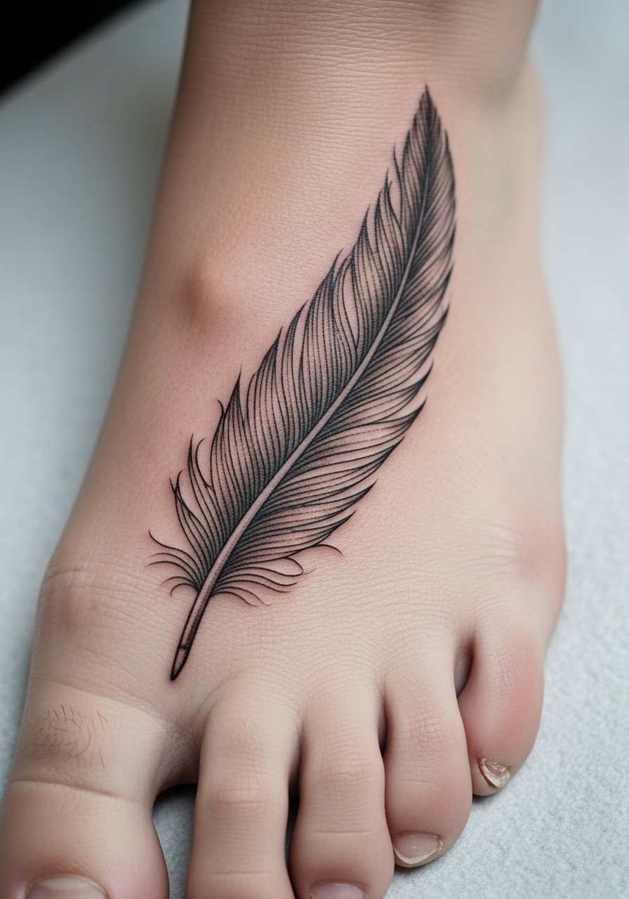 Feet are rougher on tattoos because of movement and shoes rubbing. I recommend slightly thicker quill lines for feathers on the foot. Pain is moderate to high for this spot. Expect a shorter session but possibly more touch-ups. Ask your artist about aftercare for shoes. A common mistake is relying on ultra-fine barbs. After a year, tiny barbs can melt into the skin texture. Thicker quill keeps the shape.