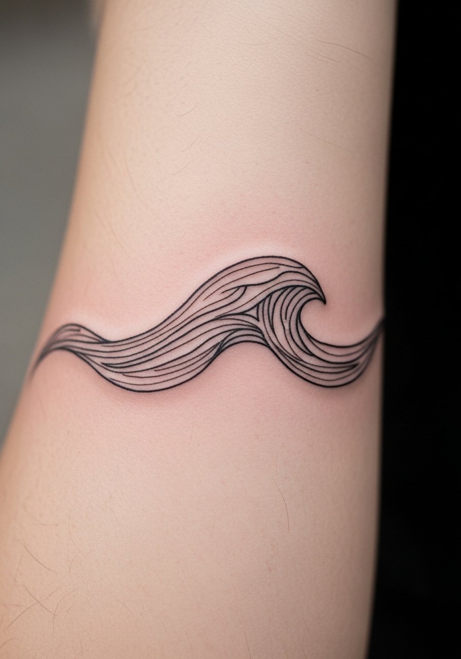 I like this for people who want a simple symbol with motion. Inner arm is forgiving for curves. Pain is low. Sessions are short. Tell your artist to keep the crest line slightly bolder. People often choose perfectly even thin curves. Healed, those can become less defined. At six months a stronger crest reads clearly and maintains the wave energy.
