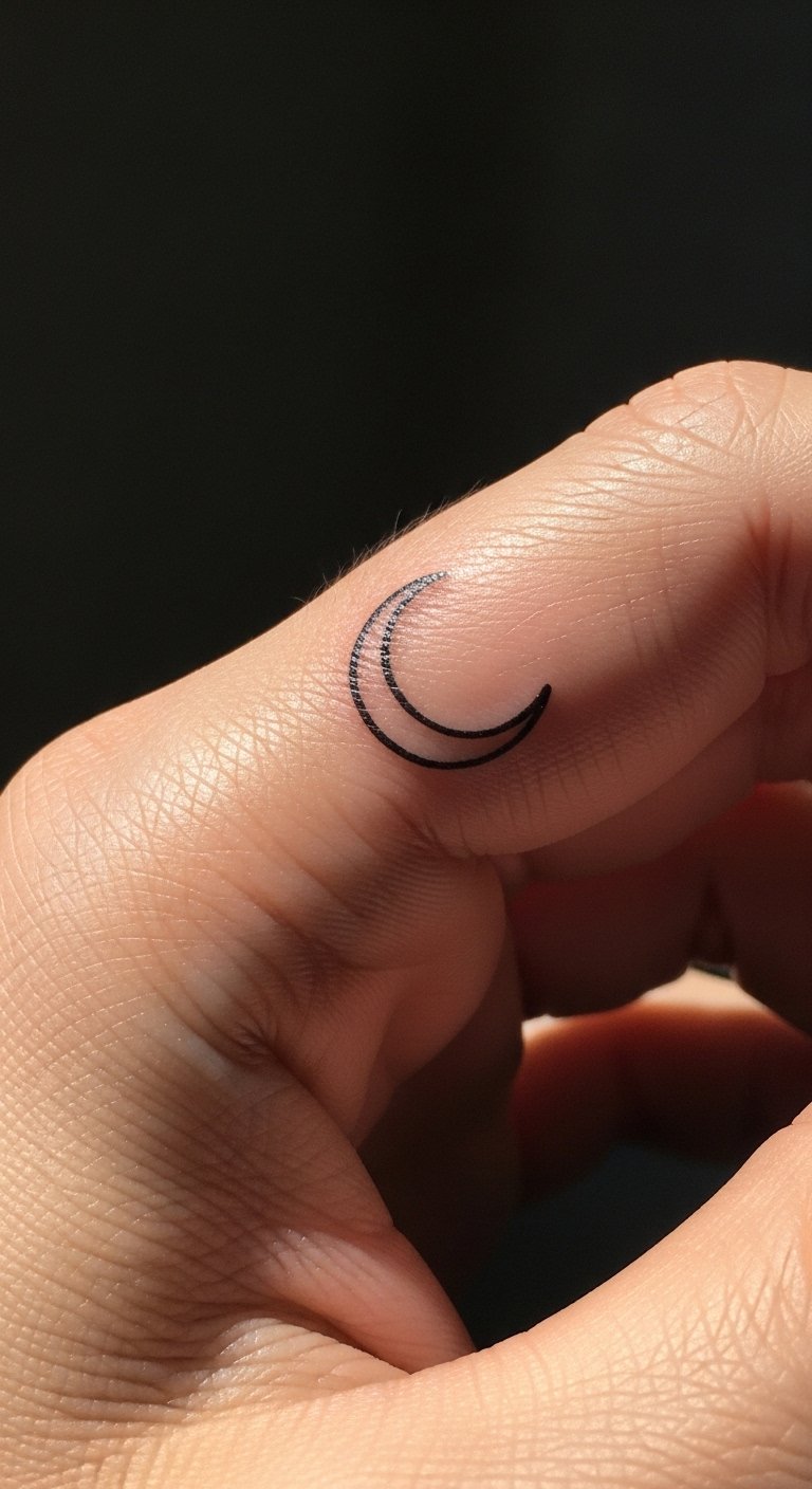 I love how a tiny crescent reads personal and timeless. Side-finger placement hides the design when you want privacy. Fine line looks elegant healed but can blur if lines are too close; ask for single, simple strokes. Expect light scabbing and 2–3 weeks for surface healing. Common mistake: trying to cram shading into the size — keep it flat black. Seek artists experienced in micro-linework.
