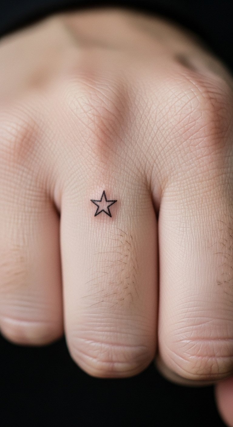 Stars are classic and read as meaningful without being loud. Above-kuckle placement shows off the design but faces more wear. Keep linework slightly bolder than ultra-fine to prevent blowout. Aftercare needs extra attention because knuckle flexing can crack scabs.