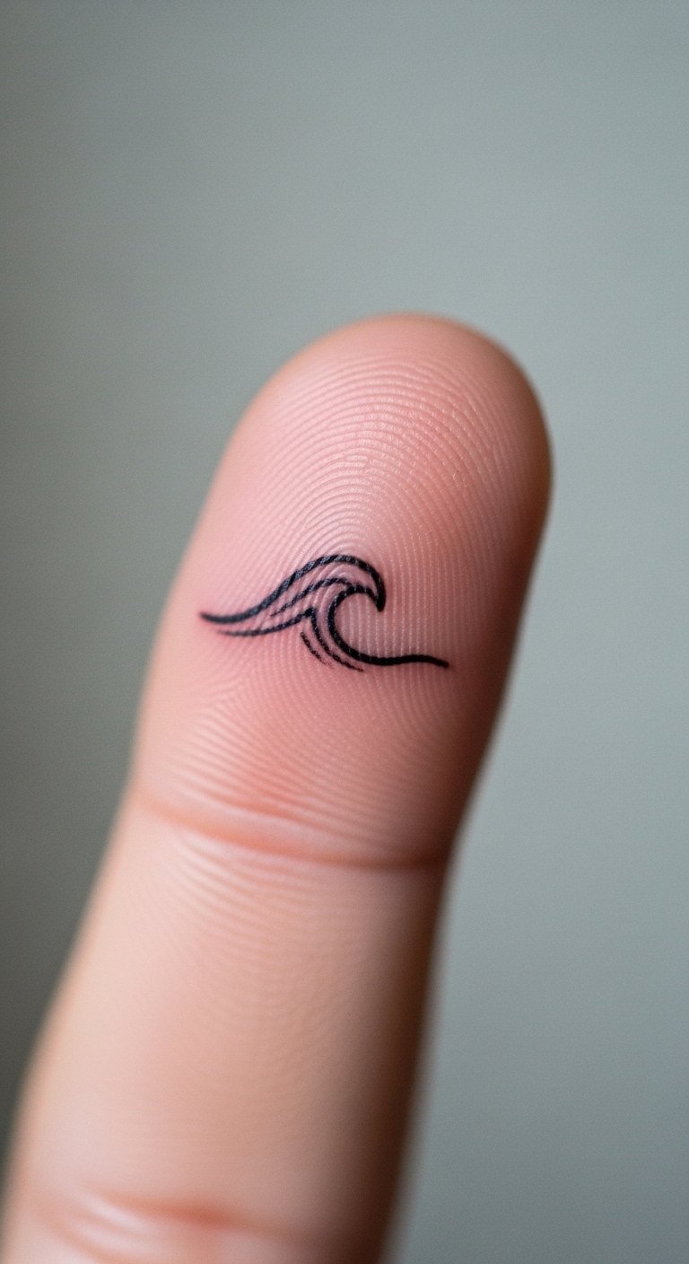 Tip tattoos often hurt more and fade faster due to exposure and skin turnover. A single-line wave reads cleanly but expect touch-ups. If you want something unique, ask for slightly thicker lines so the wave retains shape as it heals.