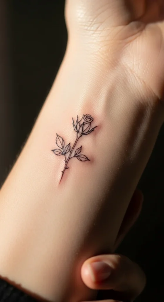 A tiny rose works beautifully when you want something soft but meaningful. It’s linked to love, inner strength, and personal growth. Fine-line versions look light on the skin and age well when kept away from sun exposure. Keep it minimal with a single stem or add negative space for a softer look. If you want a DIY prep idea, sketch a rose outline on tracing paper and test placements on your arm. Choose a small spot like the wrist, ankle, or collarbone if you prefer something subtle and gentle.