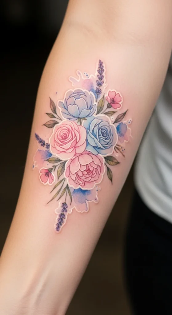 A watercolor patch adds a soft artistic effect, perfect for women who love colorful petals without heavy outlines. Keep the palette light: pale pinks, subtle greens, and muted oranges. To preview, use watercolor brushes on paper to test drops and fades. Ask your artist for gentle blending so the tattoo stays light over time.