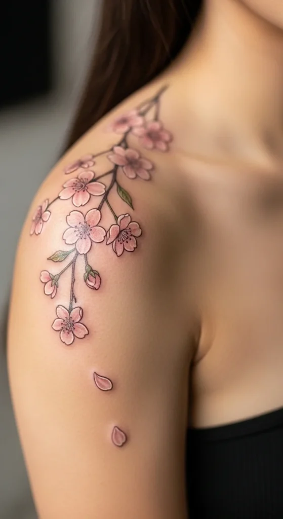 Cherry blossoms stand for transformation. They work beautifully when arranged to fall naturally down the shoulder or ribs. Keep spacing loose to create a gentle floating effect. Try designing at home by cutting small paper blossoms and arranging them on your skin to test the “drip.”