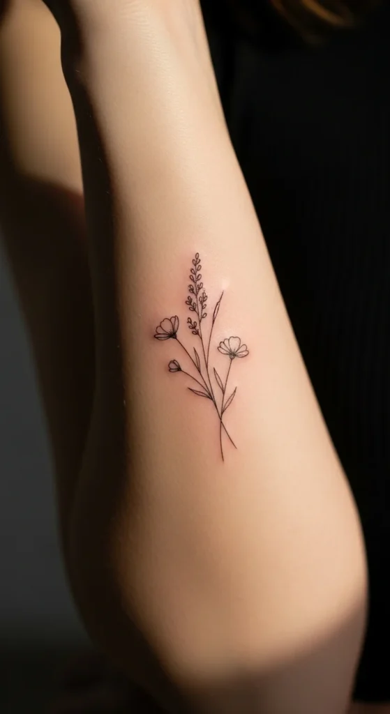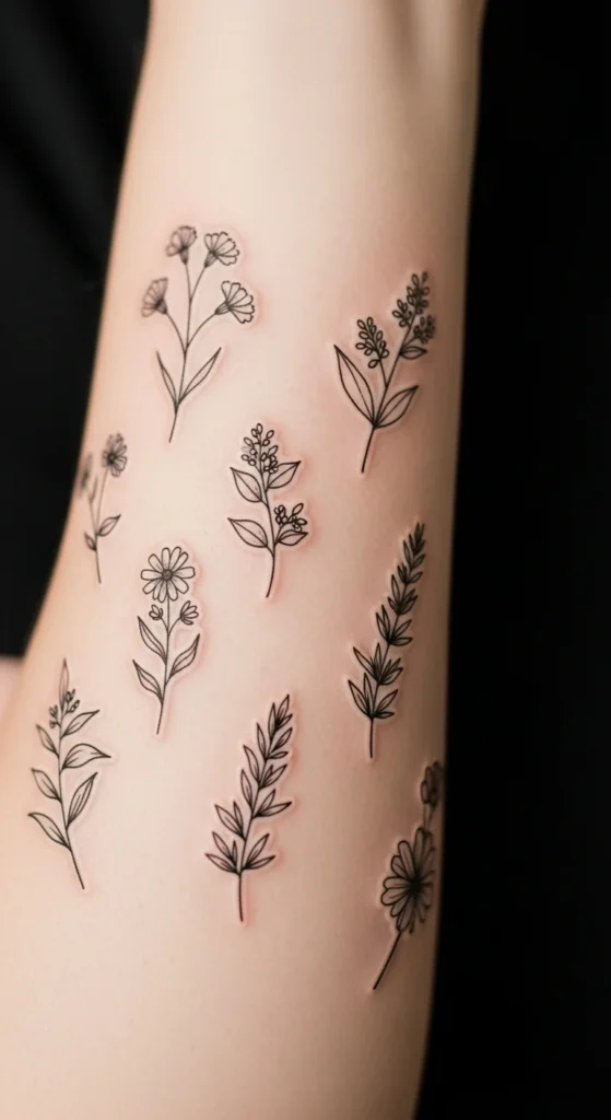 Wildflower clusters feel spontaneous and are trending strongly in the “sticker-style” tattoo trend. Each tiny flower can represent a moment or memory. They’re great for women who like building small collections over time. Keep spacing loose so each flower has breathing room. You can even test the layout with temporary tattoos to see how the cluster looks in different spots.