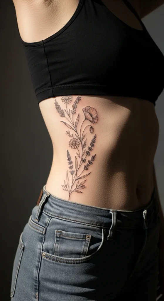 Long stems fit beautifully on ribcage curves. Choose a mix of wildflowers for a personal story. Keep the line thin and the flowers spaced to maintain a soft look. Rib tattoos can be pricier, so you can reduce cost by choosing a shorter stem or fewer petals.