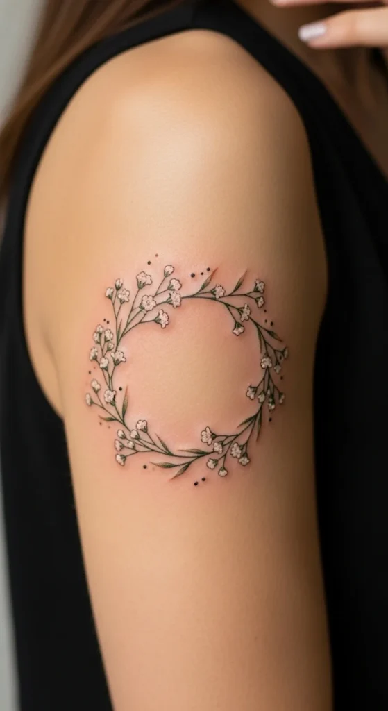 Baby’s breath symbolizes gentle affection. A halo-style ring around the arm or wrist creates a lightweight and feminine look. Because this flower uses many tiny dots, it’s more budget-friendly than heavy shading. Test a circle shape using a pencil and lightly wrap around your arm.