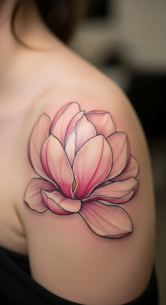 Magnolias represent quiet confidence. Their large petals sit well on wider areas like the shoulder or thigh. Keep shading soft and drawn out so the tattoo doesn’t feel heavy. For at-home planning, draw oversized petals on thin paper and tape onto your skin.