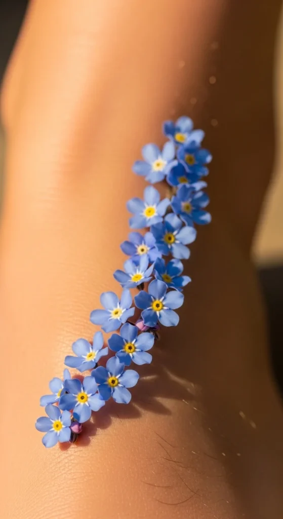 Forget-me-nots are sentimental. Tiny versions placed along a curve create a gentle path that symbolizes memories. This idea suits ankles, ribs, or behind the ear. Keep flowers very small for a soft finish. Try arranging small blue paper dots to preview the flow.