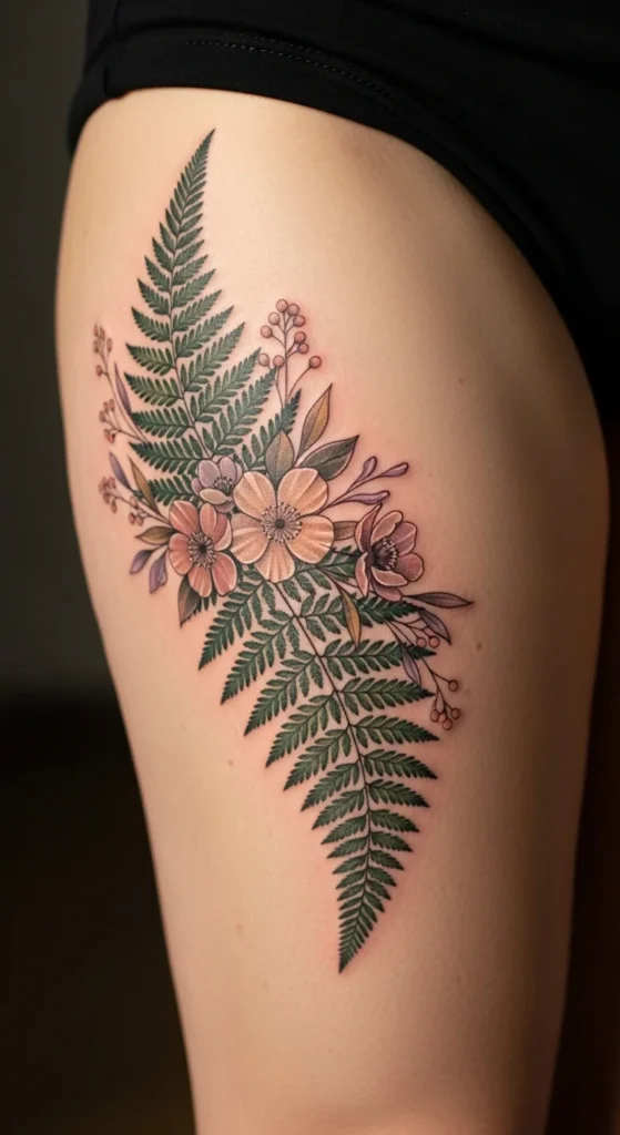 Fern leaves pair well with florals for a natural, organic feel. This design works on legs where curves allow the leaves to flow gracefully. Choose minimal shading and thin strokes. If you want to preview at home, collect fern leaves and trace their outlines on paper.