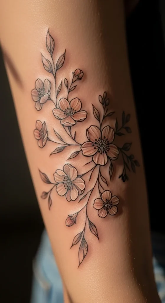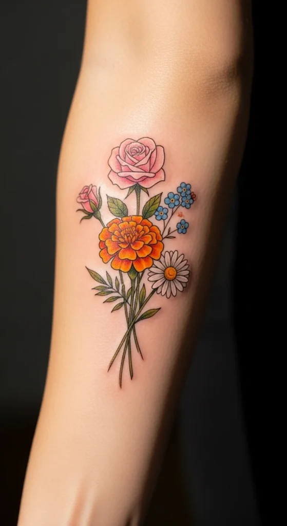 Birth flower bouquets feel personal. Each stem can represent family, children, or someone you love. They also work for women who like stackable tattoos. You can start with one flower and add more over time. Try mixing fine-line petals with tiny leaves for a balanced look. If you’re planning on a budget, print out references of your specific birth flower to test different styles. Ask your artist for a soft, airy layout that follows the natural shape of your forearm or ribs.