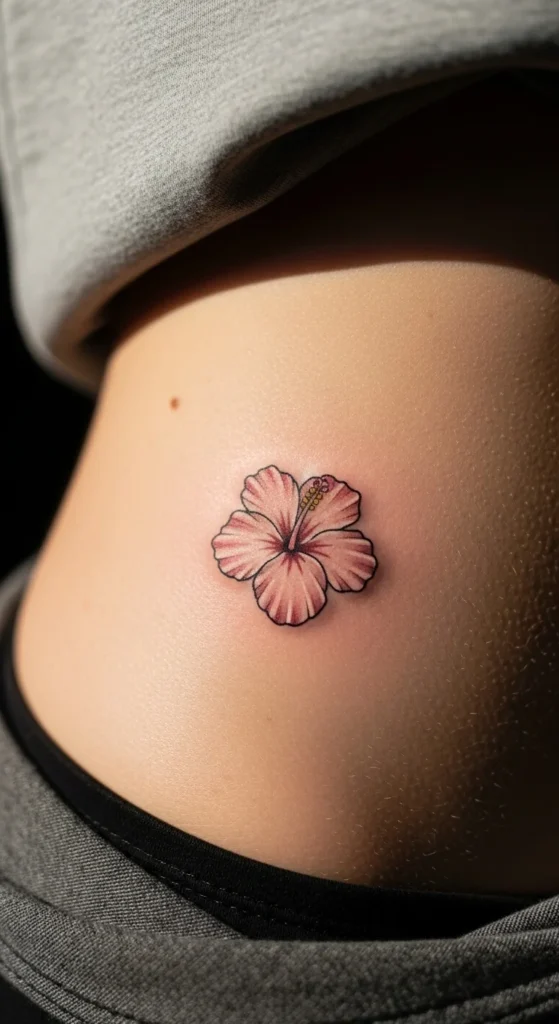 Hibiscus flowers bring feminine warmth. A tiny version on the hip adds a soft touch. Try pastel colors or fine outlines. For planning, print a hibiscus at three sizes and place them on your skin for comparison.