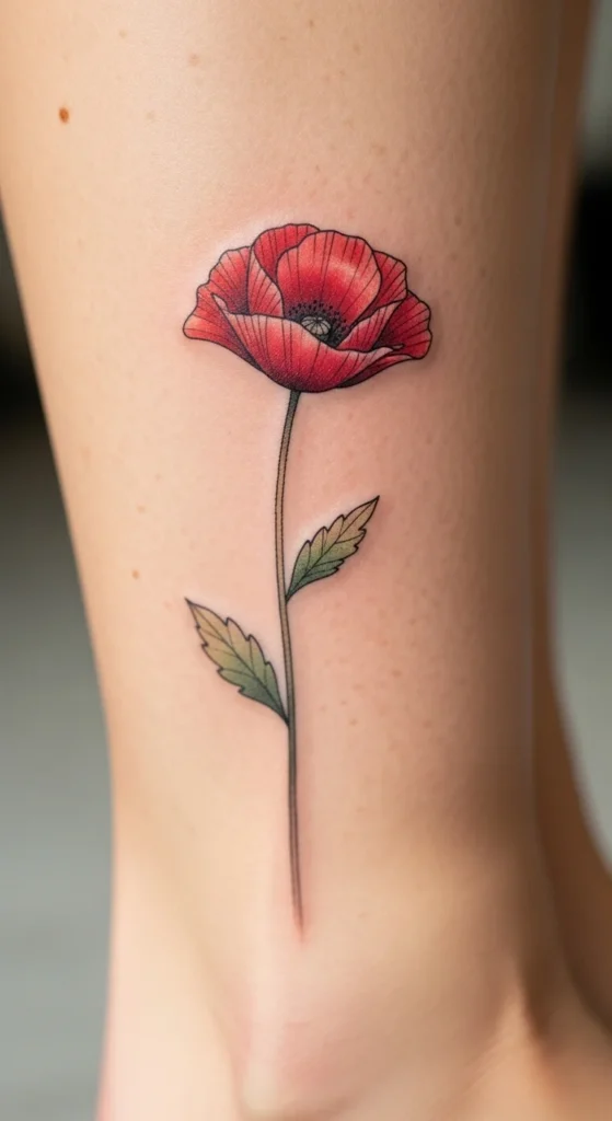 Poppies represent remembrance. A simple stem gives a soft, poetic feel. Vertical placement on the leg elongates the shape. Draw a long thin line down your leg with a washable marker to test height before committing.