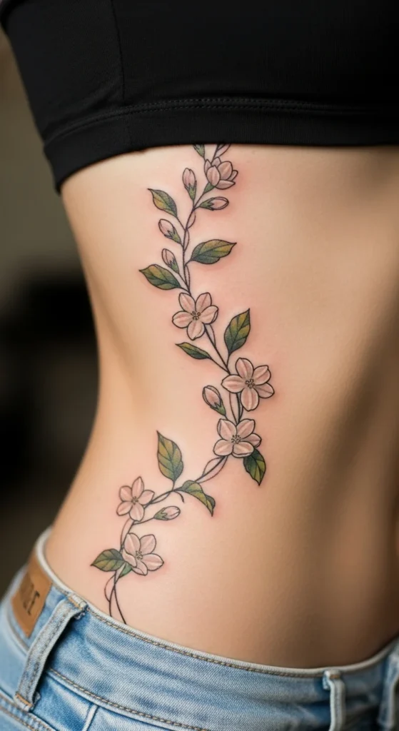 Jasmine stands for affection and purity. A trail works beautifully when following curves. Keep the flowers small so the stem doesn’t overpower the area. Try designing by arranging tiny white paper dots in a line on your side.