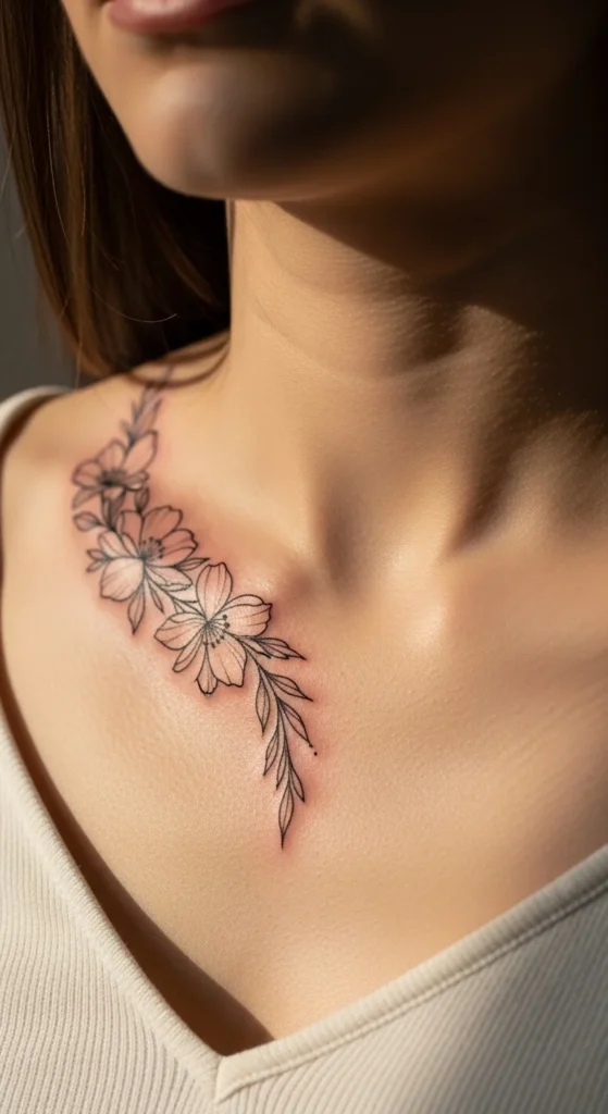 Collarbone pieces look gentle and feminine, especially when following the curve. Choose two or three small flowers to keep the look airy. For planning, draw a soft curved line on your collarbone and place small paper flowers along it.