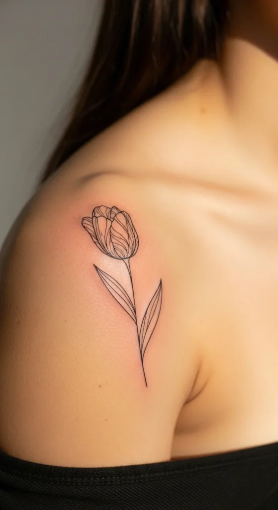 Tulips symbolize comfort and calm energy. A single-line tulip gives a smooth, flowing look that flatters curved placements like the shoulder, ribs, and thigh. This style matches current fine-line trends and stays gentle on the skin. For DIY practice, use a brush pen to trace single continuous strokes—it helps you visualize how you want the tattoo to move across your body. Keep colors soft or stick to all-black lines for a clean finish.